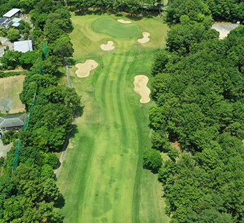 左側が高い2段グリーンで左右それぞれに違った攻め方が求められる。正面のバンカーは左をガードするが距離感を惑わす。右は奥が浅く手前も砲台。